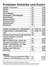 mind. 2 Menüs, Momo's, Hot Dog's, Sandwiches, div. süsse Sachen, aber auch Wein, Cüpli, Kafi Schnaps, usw.