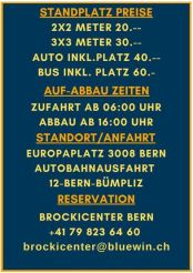 Ohne Anmeldung. Preis pro Platz draussen mit Auto am Stand = Fr. 40.—